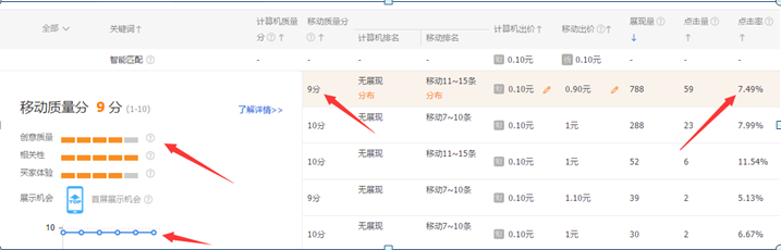 第二个就是虽然点击率很高,但是关键词的展现和点击率较低造成的。