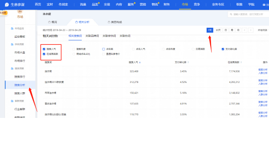勾选搜索人气、在线商品数,这里我还勾选了一个支付转化率,大家也可以根据自己的需求勾选,如果不是天猫店就要勾选商城点击占比。因为我们要找搜索热度高,在线商品少的词!c店要尽量选取商城点击占比50%以下的相关关键词,因为数据显示此时50%以上都进了天猫店,那么你选择他只会竞争更加的激烈!