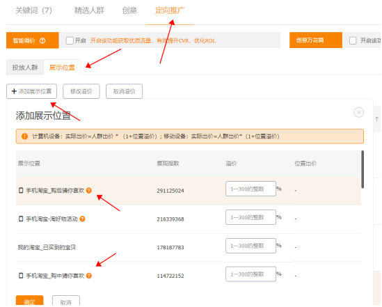 打开直通车---要入池猜你喜欢的宝贝---定向推广---展示位置---添加展示位置。前面我们讲过猜你喜欢的资源位;涵盖首页,购中,购后资源位。因此如需要对购中,购后独立设置溢价,这样我们才能在不同的展示位置拿到最好的流量。