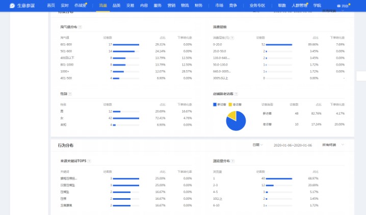 通过流量版块的数据我们可以很清楚的看出来自己店铺的进店访客是怎么样的人群。比如明明是女装店铺,但是男性客户进店消费占比更大,这就是典型的人群标签混乱。如果真有人群数据乱了的卖家,我是建议大家通过直通车去进行拉升一下的,这个之后我会详细说。