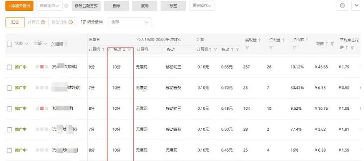 3、第三天随着出价的增长点击量会提高到40-50个,点击率比第二天涨了些;此时为了维持第四天的数据的正向爬坡,我们做了一个系统的调整,通过批量修改出价工具,将出价提升了15%;注意此时不是加入更多关键词,而是通过增加出价来获取正向数据反馈。