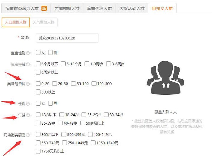 直通车也是给产品打标的一个很好很快速的方法。直通车有两种途径可以实现店铺标签的形成,第一个途径是我们经常用到的关键词推广,前期先加入我们需要的关键词,然后设置好地域、时间段的投放,然后关键词的出价不要太高,只是行业平均或者低于行业出价也是可行的,这样做的目的是我们需要通过低出价然后高人群溢价的方法来将产品送到和我们标签契合的人眼前。这里插一句话,新品期很重要,今天分享一个新品期流量如何过万的技巧,文章最后有分享,需要的可以重点看一下。如下图所示的那样,我们可以通过对客单价、性别、年龄等不同的筛选条件来选择出适合自己产品的人群,然后通过对不同人群的溢价优化来达到产品的加购收藏和成交的增加,然后逐渐形成自己产品的标签,在选择人群的时候在保证覆盖人群数量足够的情况下去尽量精细的筛选人群,不能为了人群的竞争而忽略覆盖人群的数量,如果人群数据太少的话是很难有展现的。