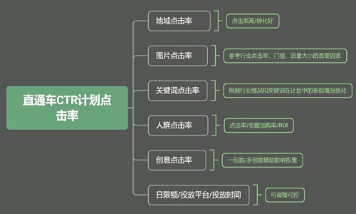 也就是直通车几大核心构成,是由图片、关键词、人群、创意、地域、日限额、投放平台、投放时间等构成,那么直通车核心是点击率,这一点是不会变的,在操作优化中,我们需要把控的整体便是计划点击率,局部也就是图中所对应的6大核心部分,也就是部分影响整体,某一因素没有合理把控,可能会影响点击率的高低和我们操作的数据表现。