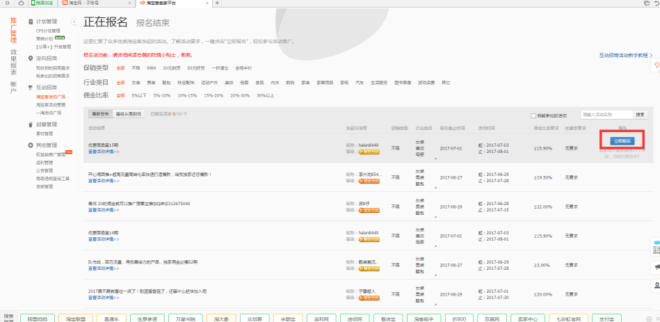 点击进入淘宝客活动广场,大家可以看到一些活动,可以选择报名。在这个页面我们能看到每个淘宝客的等级,等级越高就证明他的资源量越丰富。报名的时候要注意他的活动介绍和相对应类目的佣金比例。