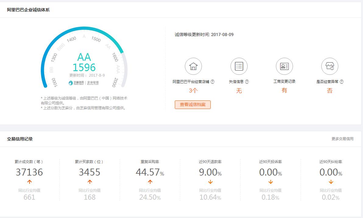 说到六项交易信用记录包括我们的累计成交数、累计买家数、重复采购率、近90天退款率、近90天投诉率、近90天纠纷率。在这六项指标下面,我们还可以参考到同比行业均值,帮助我们去分析这家店铺是高于行业水准还是低于行业水准。