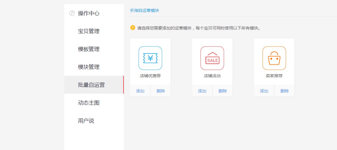打开你店铺的无线运营中心的页面,进入详情装修,在右上角有一个模板管理,打开后我们可以看到有三个模块,优惠券,店铺活动和宝贝推荐。如下图所示,
