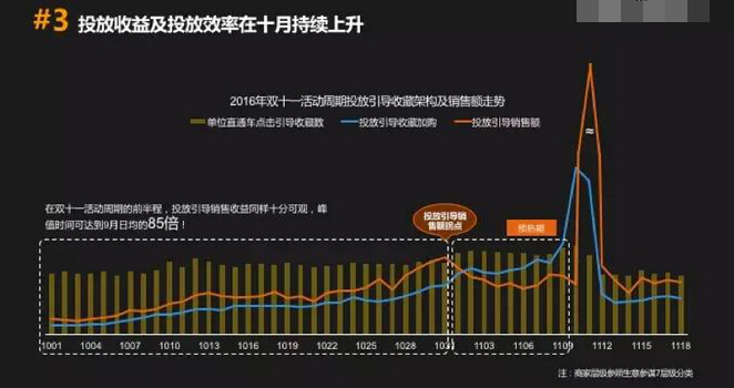 对于女装的双11而言,这个拐点出现在11月1日,这相较于其他行业是大幅滞后的,这主要和女装的消费群体有关,因此在10月,商家依旧有大把直接引导销售的机会,而此时的流量较之前已经出现了明显的提升,因此由投放所带来的引导销售也明显提升。在10月底的时候,甚至可以达到9月日均的85倍。