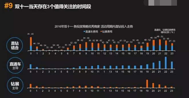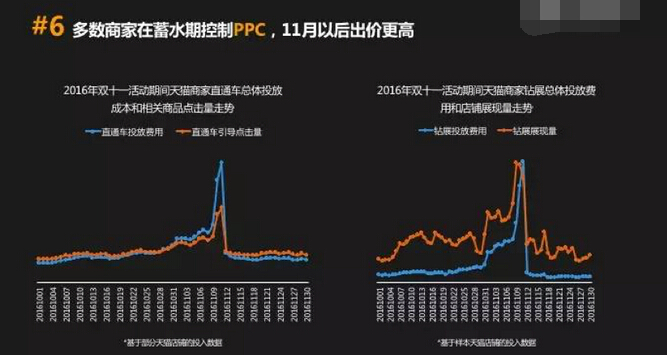 根据这张图可以看出,直通车是一个更高效、更容易评估的渠道,但直通车是基于搜索这个条件来的,所以在双11的场景下,钻展可以带来的流量更加惊人。直通车优势在于它的成本更可控,收益更可预知。这与我们看到蓝色线的变化趋势也是一样,左边比右边更稳定,也更接近于点击量的走势。