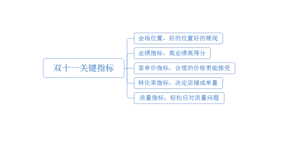 业绩指标,高业绩高得分。这里的业绩指标有两部分组成:第一部分是通过自然流量带来的业绩指标,第二部分是根据会场预估所能实现的双十一业绩指标。业绩指标是可以根据上一年度相关数据,或者竞争品牌相关数据作为参考来预估和制定。