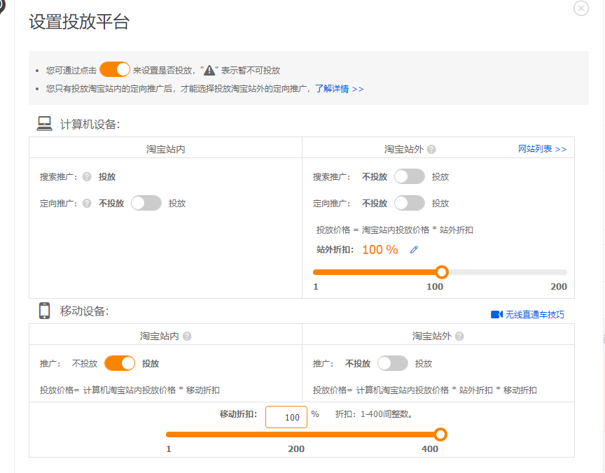 日限额设置好就可以设置投放平台,站外不投,因为带来的流量不够精准,Pc端默认投放,不出价就可以,移动折扣比例100%。