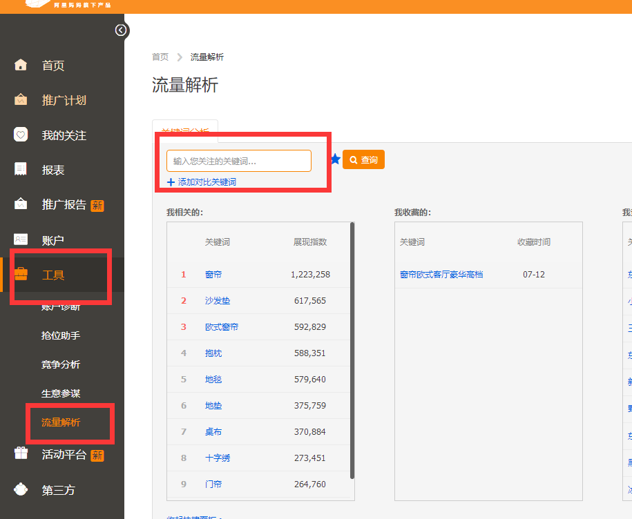 ①选词:初期五个词就够了,选择目标关键词也就是标题中的关键词、引流词,选择质量分满格,相关性满格的词 ,看关键词在直通车中的数据→流量解析→输入关键词就可以看到数据