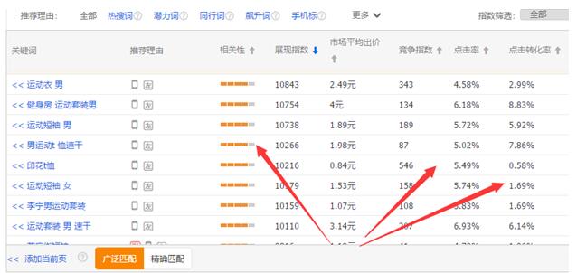 首先点击直通车里面的添加关键词,会出现上面的图片,这个时候我们需要点击展现指数,让推荐的关键词展现指数由高到低展示,这是为了方便我们选择关键词,因为不同情况下的直通车对关键词展现指数的选择标准是不同的,在直通车初期就要选择1万左右的词,而在直通车带动自然搜索的时候,预算充足和选择的关键词精准的情况下,展现指数肯定是越高越好。这里插一句话,质量分是直通车的核心,我这里有一个直通车三天十分的技巧,需要的可以加我旺旺,北蔡说,回复,质量分,送你。所以这样排序更方便我们选定展现指数区间,找好自己的区间之后剩下的选词标准就是先判断这个词是不是适合我们,然后再看点击率和转化率怎么样,在直通车涨分期更多的是看点击率,而直通车带动自然搜索的时候再看点击率的同时看一下转化率了,具体的标准一般点击率超过3都是可以的,而转化率超过1就可以了。最后才是看相关性,满格的直接用就可以了,不满格的可以记录一下然后在创意标题里面加上。